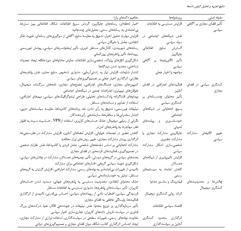 This study aims to examine the role of virtual space in political activism and electoral participation among Iranian youth born in the 1990s, analyzing the changes in political and social participation patterns influenced by social media platforms. This research utilized a qualitative methodology with semi-structured interviews as the primary data collection tool. A total of 24 participants from Tehran, all born in the 1990s, were selected through purposive sampling. The interviews focused on their experiences with political activism and electoral engagement through virtual platforms. Theoretical saturation was reached after 24 interviews. NVivo software was used for qualitative data analysis, employing open, axial, and selective coding to identify emerging themes and patterns. The findings revealed that social media has significantly transformed political participation among young Iranians. Participants reported that online platforms increased access to political information, facilitated political discussions, and enabled digital activism through campaigns, petitions, and hashtags. However, they also highlighted challenges such as government restrictions, censorship, misinformation, and algorithmic bias that shape political discourse. While many young people engage in virtual activism, some expressed skepticism regarding its real-world impact and emphasized the gap between online discourse and policy-making. Additionally, some participants noted a shift from traditional forms of political participation, such as street protests, to digital engagement. This study confirms that social media plays a pivotal role in shaping political activism and electoral engagement among Iranian youth. While it provides opportunities for mobilization and participation, challenges such as misinformation, censorship, and surveillance hinder its full potential. The findings suggest the need for further research on the long-term effects of digital political engagement and the development of educational programs to enhance critical media literacy among young users.